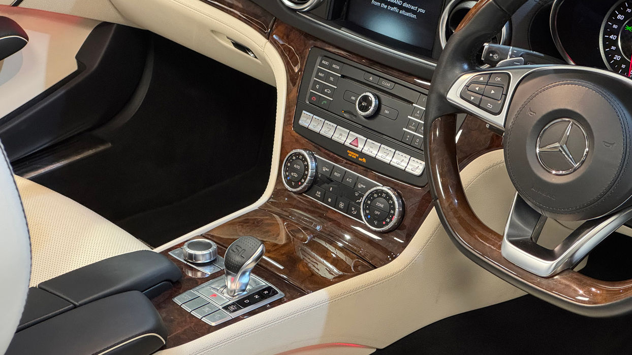Externally, the car sits proudly on the optional 19" AMG Multi-Spoke alloy wheels, perfectly proportioned to enhance its elegant yet athletic appearance. The SL’s long bonnet, sculpted lines, and wide rear stance give it real road presence—photographs simply don’t capture the way it turns heads in person.